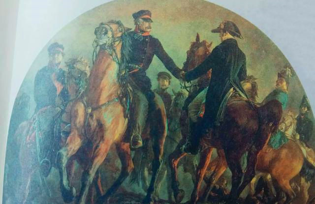 ▲:在滑鐵盧大戰的關鍵時刻,布呂歇爾率軍趕到,與惠靈頓大軍會合的情景