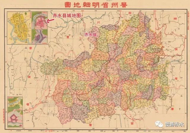 最近在一張出版于民國二十六年(即公元1937年)十一月的貴州省全省地圖中,發現了里面有一幅當時的遵義赤水縣縣城地圖。赤水縣作為貴州省面向四川省的北部門戶,一直都是川黔交往的重要之地。