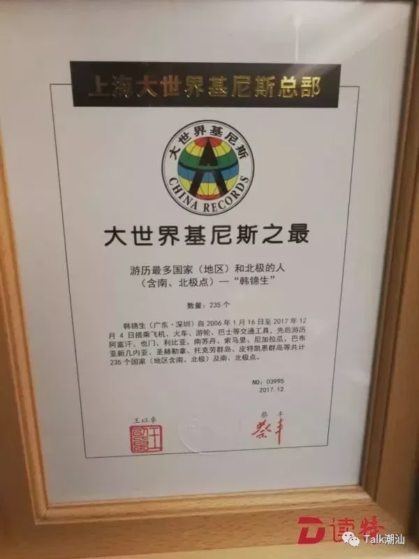 世界上游歷最多國家和地區(含南北極點)的人,是來自廣東省揭陽市揭西縣的韓錦生。