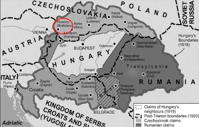 1918年11月,德國宣布投降,一戰以德奧為首的同盟國陣營的失利而告終。作為戰爭的發起者的奧地利和匈牙利都受到了嚴厲的懲罰,被剝奪了大量的領土。關于波佐尼(普雷斯堡)的歸屬問題成為了劃分的棘手問題。