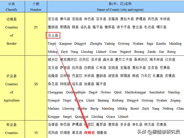 西藏的縣分為邊境、農(nóng)業(yè)、牧業(yè)、農(nóng)牧業(yè)、一江兩河開發(fā)、糧食基地6個類型。日土縣屬于邊境縣,改則縣屬于牧業(yè)縣。
