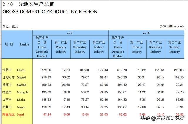 由于人口稀少,不便經(jīng)濟經(jīng)濟統(tǒng)計,目前只有阿里整個地區(qū)的GDP。2017到2018年,農(nóng)業(yè)幾乎沒有增加,第二產(chǎn)業(yè)工業(yè)從15.55增加到19.12億元,增加23%,第三產(chǎn)業(yè)從25.03增加到26.82億元,增加7%??傮w從47.24增加到52.62億元,增加11%。