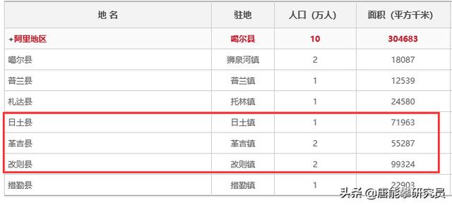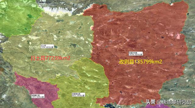 這兩個縣人口分別在1、2萬人,面積日土縣為71963平方公里,改則縣為99324平方公里。此數(shù)據(jù)來自2018年的民政部門(審圖號GS-2018-2512號),與下面的數(shù)據(jù)不符(77239平方公里和135799平方公里),目測來看下面的數(shù)據(jù)是更符合。