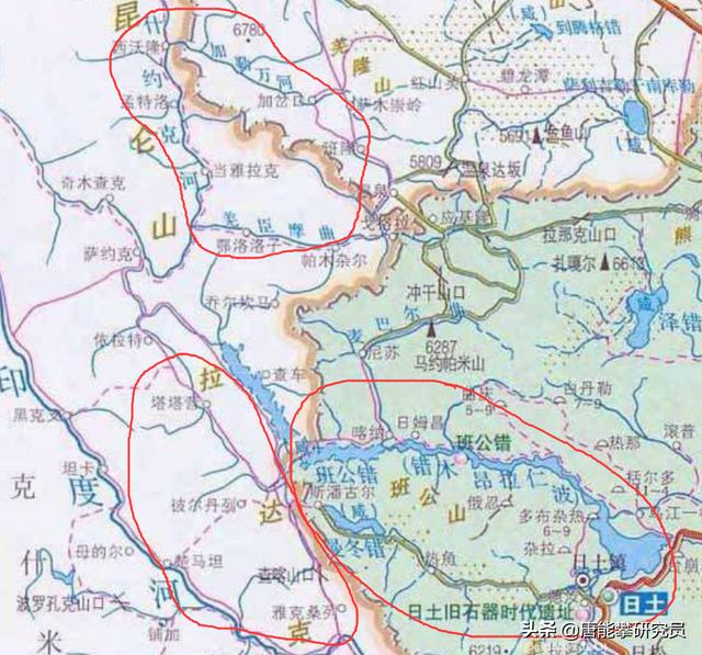從放大圖上的北部,可以看到著名的羌臣摩山和羌臣摩河。