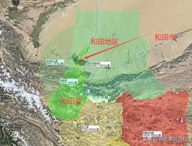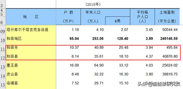 前面已經涉及到和田市與和田縣的土地數量,即土地面積,和田縣為4萬多平方公里,和田市為400多平方公里,和田縣粗略為和田市的100倍。
