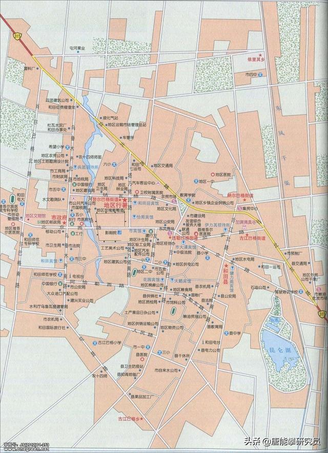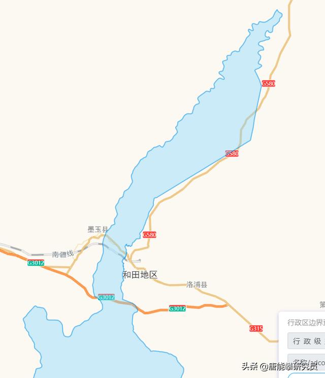 和田縣的南部為高原地區,內有著名的阿克賽欽湖。北部放大圖如上圖所示,居住區主要位于玉龍喀什湖綠洲中。