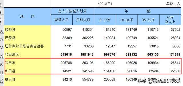 從上表可以看出,和田市與和田縣的一個主要區別在于,和田市城鎮化率超過一半,城鎮人口超過鄉村人口,均達到20萬人。而和田縣的城鎮人口僅有約1.45萬人,鄉村人口遠多于城鎮人口。