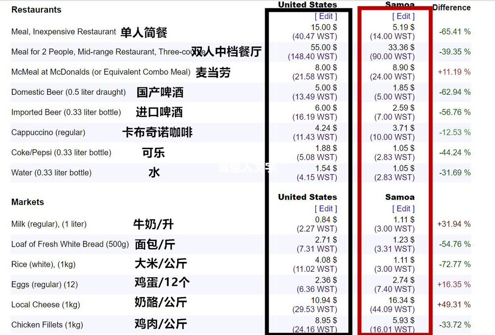 美國的生活物價相對部分亞洲國家還要低,如美國超市內1升牛奶僅售0.84美元、2升橙汁或一只1.5公斤重的雞都是3美元、1公斤豬肉和牛肉的價格也基本在4-7美元之間。作為美國現有殖民地美屬薩摩亞的平均生活物價卻比美國本土還低50%,大米價格差甚至超過72%,也因此被游客譽為“物價和發展程度都是最低的南太平洋度假島”。