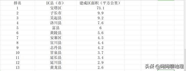 延安市建成區面積排名,寶塔區最大,黃龍縣最小,了解一下?