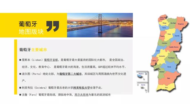 從葡萄牙地圖來看,整個葡萄牙是一種長條形結構,那么我這邊給大家介紹幾個重點城市,里斯本(Lisbon)是葡萄牙首都,是葡萄牙最大最富庶的國際化大都市,是全國政治、經濟、文化、教育中心,波爾圖位于葡萄牙北部,是葡萄牙第二大城市,法魯位于葡萄牙最南端,瀕臨地中海,是非常著名的旅游城市。
