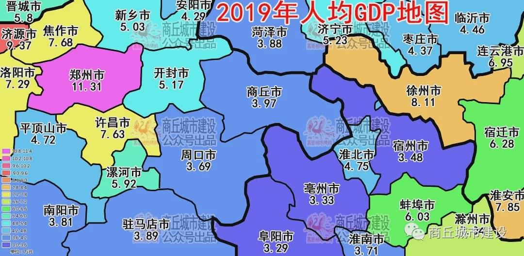 上升數(shù)位!商丘市周邊城市2019年人均GDP排名地圖