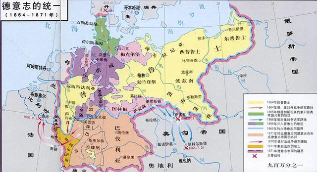 1848年德國各地爆發(fā)革命,普魯士邦的首相俾斯麥于1864年聯(lián)合奧地利擊敗丹麥,收回北方被丹麥占領(lǐng)的土地;1866年的“七星期戰(zhàn)爭”中擊敗奧地利,次年建立北德意志邦聯(lián);1870年發(fā)動(dòng)普法戰(zhàn)爭,德國南部多個(gè)邦脫離法國統(tǒng)治,1871年完成了德意志統(tǒng)一并建立了德意志帝國。