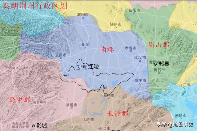 圖中虛線范圍為當代荊州市的行政區劃。秦朝統一后重新劃分天下,如今的荊州地區基本歸南郡所轄,而實際上南郡在秦朝尚未統一時便已設立。南郡治所在江陵縣,也就是今天的荊州市區附近。雖然此時的南郡相當于現在的省級行政單位,但能算是如今荊州市的行政區劃建制起源,并且傳承至今。從楚文王遷都于郢起,荊州便是這一帶的政治中心。