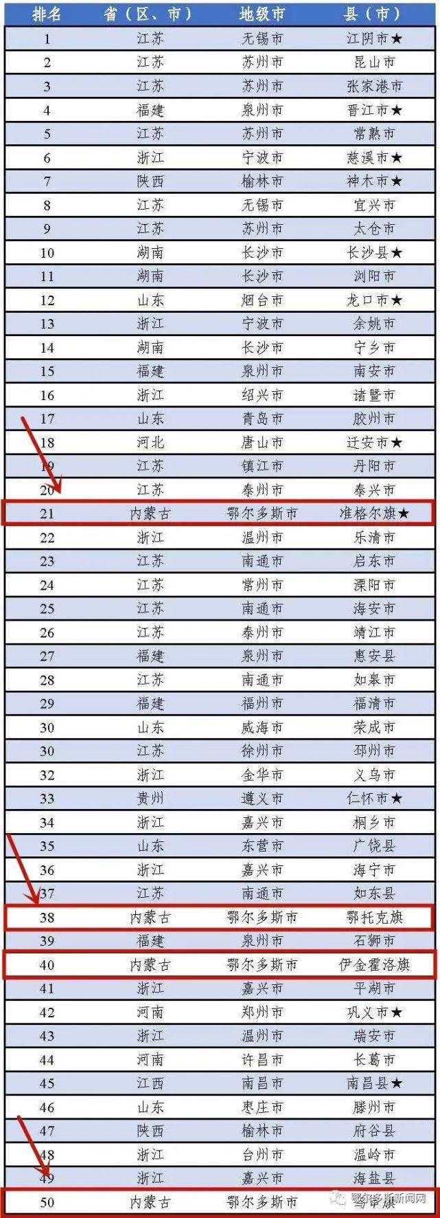 11月13日,中國(guó)信息通信研究院主辦的中國(guó)縣域工業(yè)經(jīng)濟(jì)發(fā)展論壇上,發(fā)布了《中國(guó)縣域工業(yè)競(jìng)爭(zhēng)力地圖》,揭曉了2020年“中國(guó)工業(yè)百?gòu)?qiáng)縣(市)”榜單。鄂爾多斯市的準(zhǔn)格爾旗、鄂托克旗、伊金霍洛旗、烏審旗上榜,分別位于榜單中第21位、38位、40位、50位。鄂爾多斯是此榜單中內(nèi)蒙古唯一上榜城市。