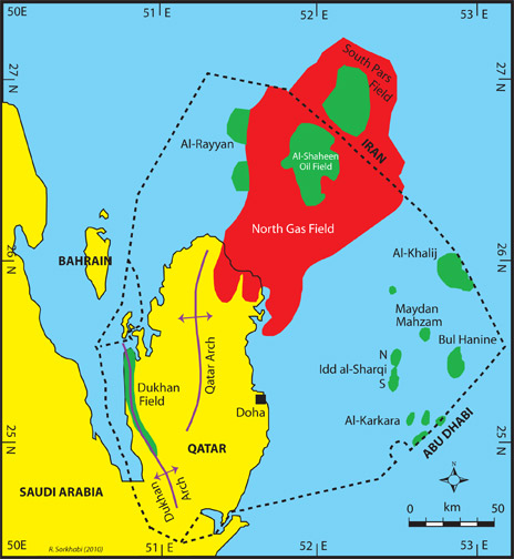 不過,石油并不完全是卡塔爾發家致富最重要的途徑,其“一夜暴富”的背后,另一項產業——天然氣功不可沒。卡塔爾于1971年在其北部領海發現了北方—南帕斯氣田,其總面積達9700平方千米,幾乎和卡塔爾領土面積差不多大了。該氣田由卡塔爾與伊朗兩國共享,其北部3700平方千米位于伊朗領海內,被稱為南帕斯氣田,其余南部6000平方千米位于卡塔爾領海內,被稱為北方氣田。