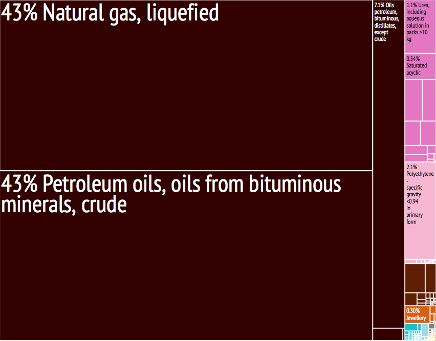 卡塔爾2011年出口產品類別比例圖,可見天然氣產品與石油產品幾乎各占半壁江山。