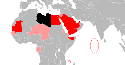 紅色為與卡塔爾斷交的國家,粉色為降低與卡塔爾外交關系等級的國家