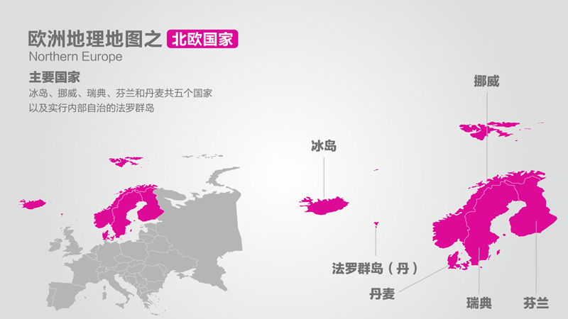北歐地區一般是指:冰島、挪威、瑞典、芬蘭、丹麥五國和丹麥自治領地法羅群島,北面是北冰洋,西臨北大西洋,格陵蘭島雖然也是丹麥屬地,但在地理上是屬于北美洲,所以就不提了。