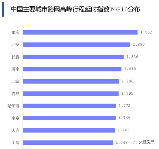 大連市的凌奧街-博遠路-軟件園路上班路線,駕車通勤里程為4.7公里,駕車通勤時間19分鐘,其早高峰擁堵延時指數(擁堵延時指數=交通擁堵通過的旅行時間/自由流通過的旅行時間)達到2.56,是全國前十大熱門上班路線中延時指數最高的路線。高德稱,此路線因擁堵造成的人均月經濟損失達到123元。