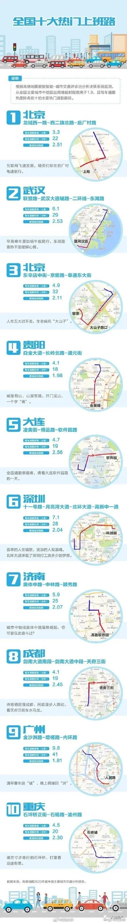 報告首次對外發布了 “全國十大熱門上班路”榜單。其中,“北京市龍域西一路-西二旗北路-后廠村路”駕車通勤熱度最高,居于榜單首位。數據顯示,該路段平均駕車通勤里程為3.3公里,早高峰擁堵延時指數達2.51,駕車通行時間為22分鐘,據核算,早高峰因擁堵造成的人均通勤月經濟損失為167元。