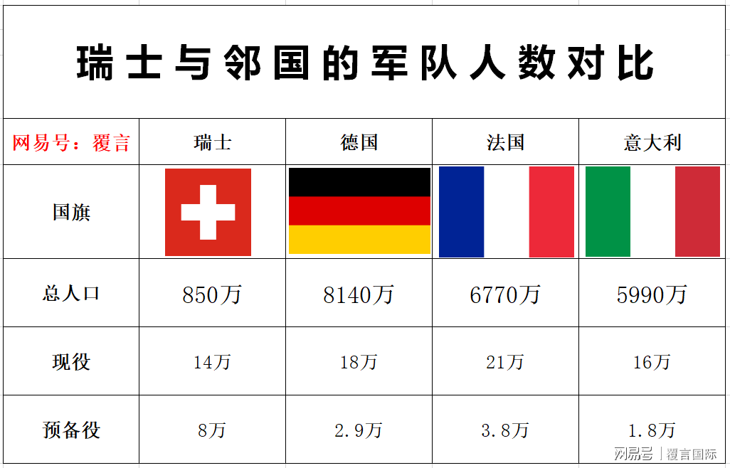 這是什么概念呢?覆言做了一個(gè)統(tǒng)計(jì)表格,將瑞士與鄰國(guó)的軍隊(duì)人數(shù)進(jìn)行對(duì)比。