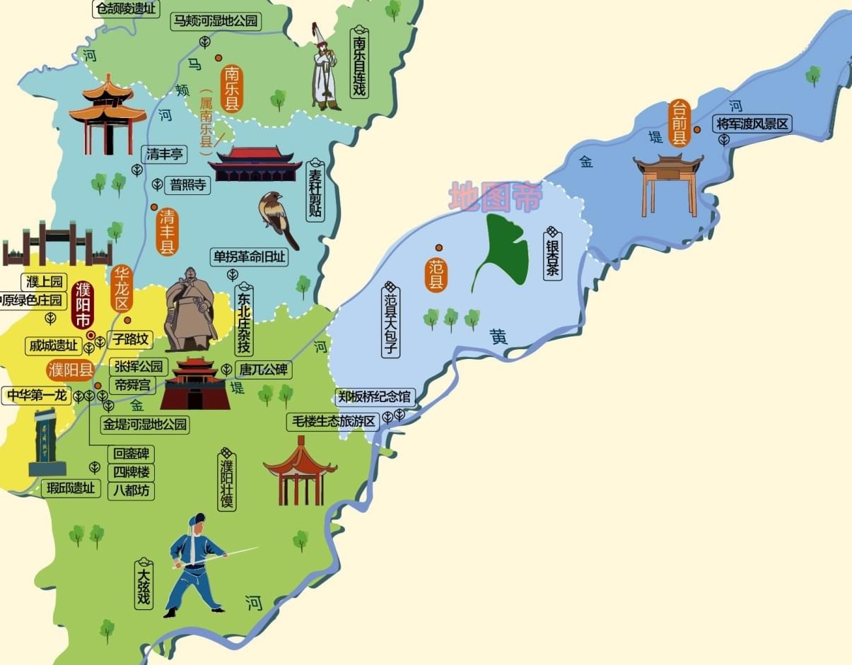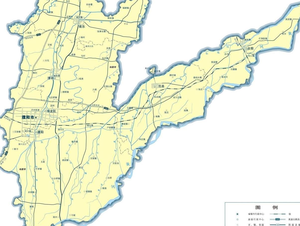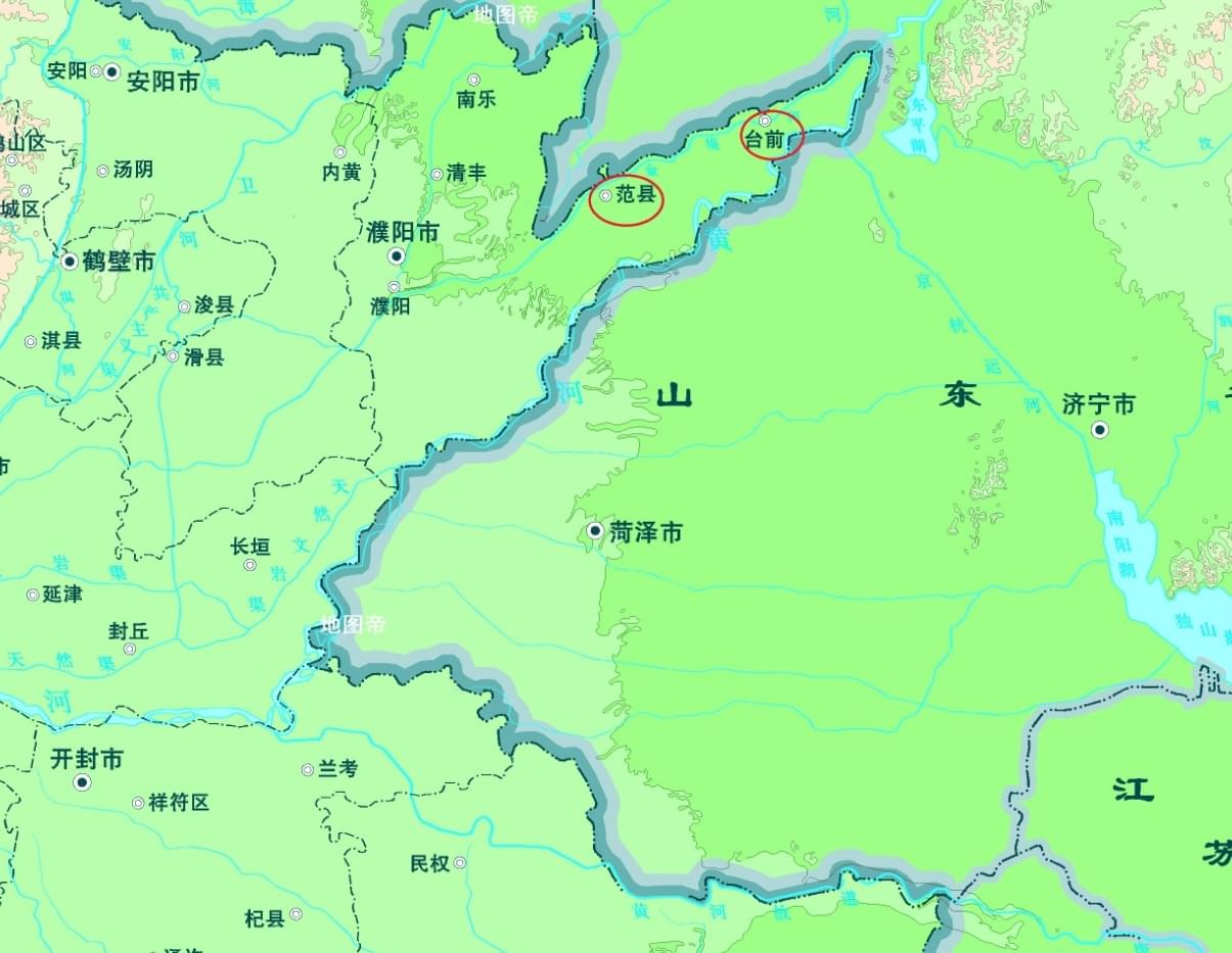 濮陽市,位于河南省東北部,冀、魯、豫三省交界處,按順時針方向分別與山東省聊城市、泰安市、濟寧市、菏澤市,河南新鄉市、安陽市,河北邯鄲市相鄰。濮陽之名始于春秋戰國時期,因位于濮水北岸而得名,曾為衛國都城。如今濮陽市面積約4188平方公里,下轄1區5縣:華龍區、濮陽縣、清豐縣、南樂縣、范縣、臺前縣。范縣和臺前縣就是濮陽市踹向山東的那條“腿”。