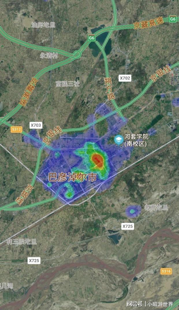 巴彥淖爾,位于內(nèi)蒙古西部,總面積6.4萬平方公里,總?cè)丝?68.5萬人,生產(chǎn)總值740.1億元。巴彥淖爾是黃河北岸的城市,這里也是河套平原,地勢平坦,從北京到西藏、新疆的高速公路都經(jīng)過巴彥淖爾,由于再往西就進(jìn)入阿拉善沙漠地區(qū),巴彥淖爾是重要的交通補(bǔ)給站。城區(qū)面積不大,熱力圖也不突出,河套學(xué)院就在這里。