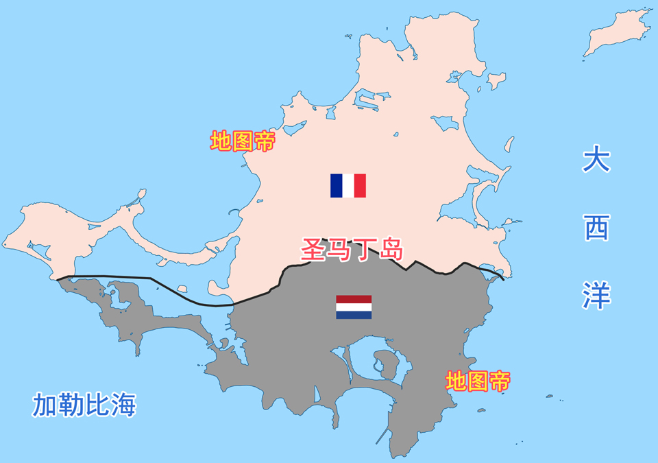 法國(guó)占圣馬丁島北部,面積約53平方千米,荷蘭占圣馬丁島南部,面積約34平方公里。