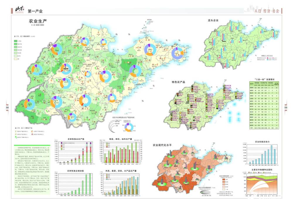 地圖集的基礎數據采用了山東省最新地理信息數據成果,包括全省數字地形、地理國情監測、地名地址、遙感影像和數字高程模型等數據。專題資料包含全省經濟、歷史、文化、自然環境等領域的權威統計數據。