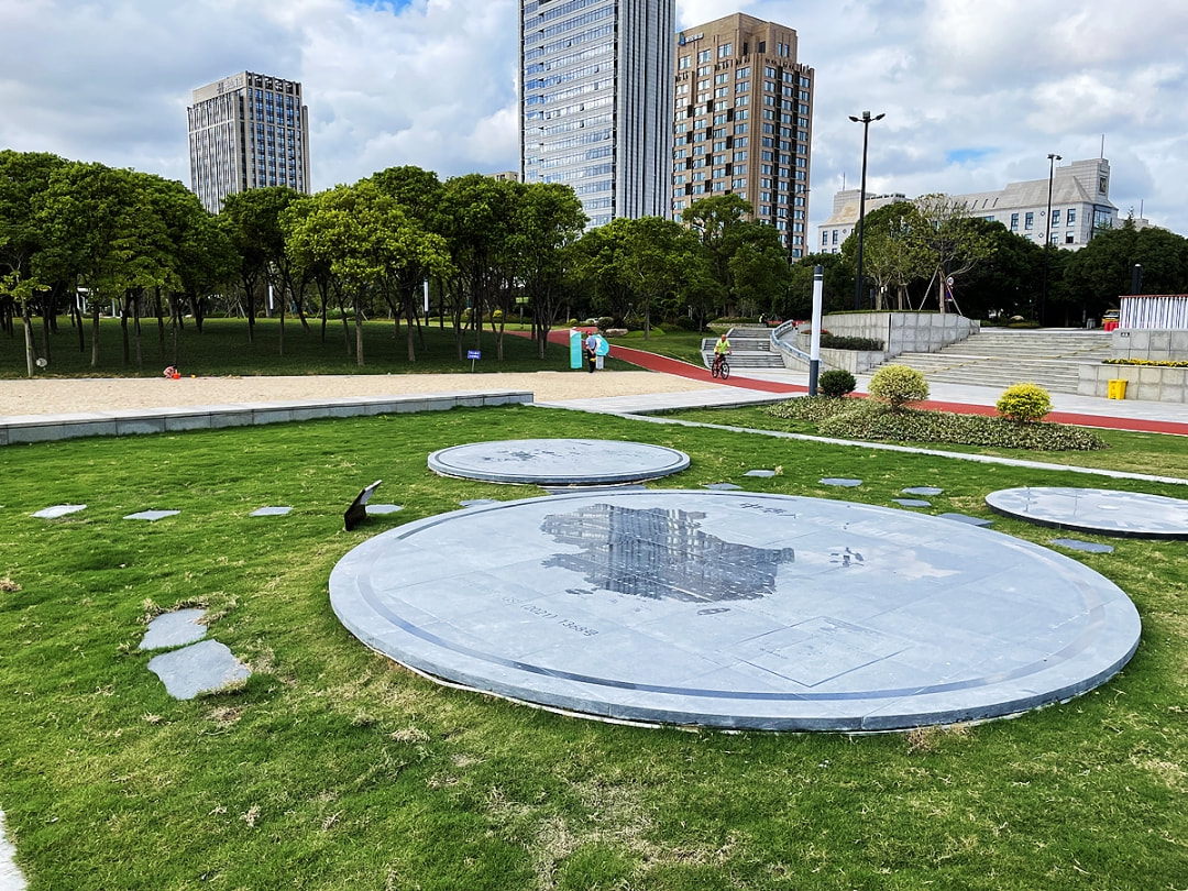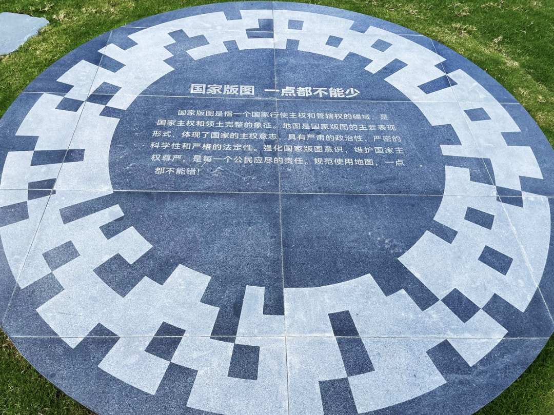 首座景觀型永久性測量標志總占地約190平方米,由水準點、觀景臺、花崗巖石板、不銹鋼立體雕塑、綠化等組成,并于石板上雕刻了標準的中國地圖、舟山地圖以及景觀型測量標志簡介、測繪知識等測繪地理信息相關內容。