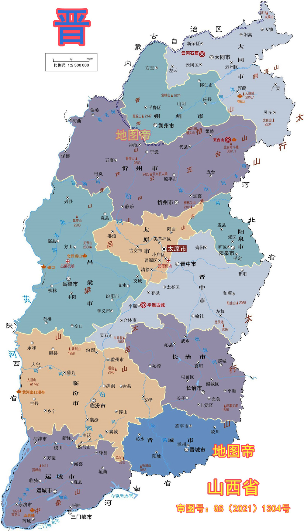 山西省簡稱“晉”,省會太原,有11個地級市:太原市、大同市、朔州市、忻州市、陽泉市、呂梁市、晉中市、長治市、晉城市、臨汾市、運城市。