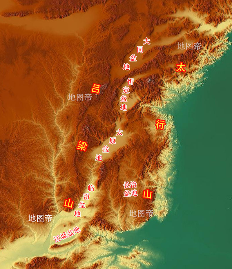 山西省東有太行山脈,西有呂梁山脈,中間是一條盆地平原走廊,形成五大盆地:大同盆地、忻[xīn]定盆地、太原盆地、臨汾盆地、運城盆地,加上東南部太行山脈上的長治盆地(上黨盆地),組成山西六大盆地。