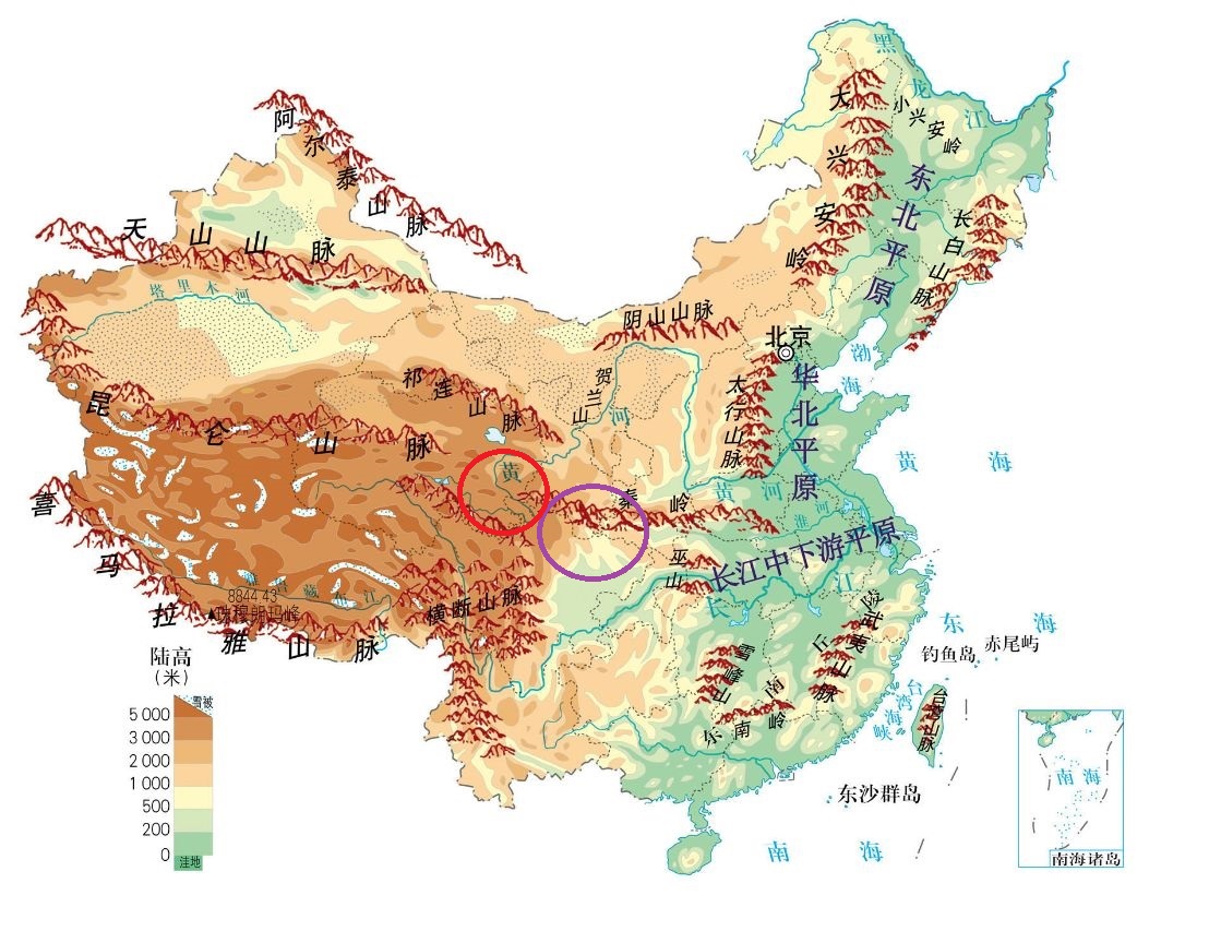 下面是甘肅省的地形區(qū),直線是甘肅省兩個(gè)大地區(qū)的分界線,兩個(gè)圈卻是甘肅省南部兩個(gè)名稱類似的“另類地區(qū)”。