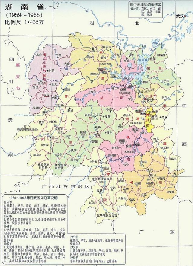 第二張圖是1959-1965的湖南省地圖。相比于1958年,這期間的湖南省在湘潭專區的基礎上新設了岳陽專區,同時也設立了益陽專區和零陵專區。