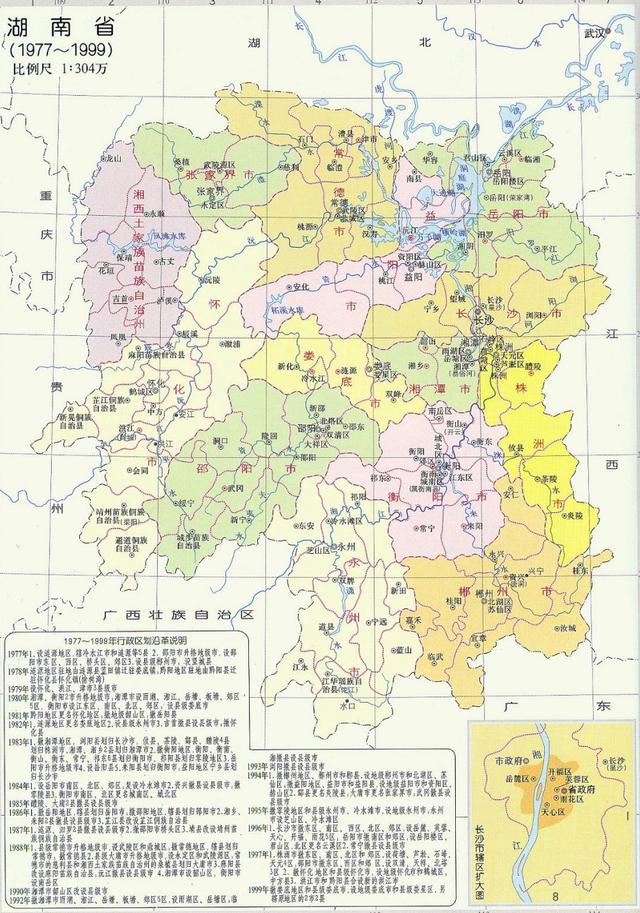 第四張圖是1977-1999年湖南行政區劃圖。1980年,湘潭、衡陽二市升為地級市;1981年,改黔陽地區為懷化地區,并撤銷了地級韶山區;1982年,漣源地區改為婁底地區;1988年,常德市、大庸市升級為地級市;1994年,大庸市改名為張家界市;1995年,撤銷零陵地區,設立永州市;1999年,撤銷婁底地區,成立婁底市。