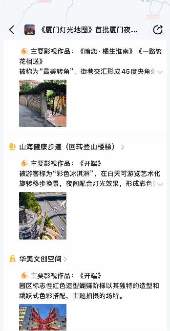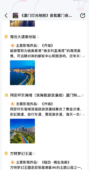 高德指南發布的智能版廈門燈光地圖中,除了廈門夜間出游新老地標外,還特別增添了影視打卡地的推薦內容。比如,熱播電視劇《開端》中反復出現的海滄大道泰地站、廈門山海健康步道、中山路等取景地,在這次的燈光地圖上都有標注。