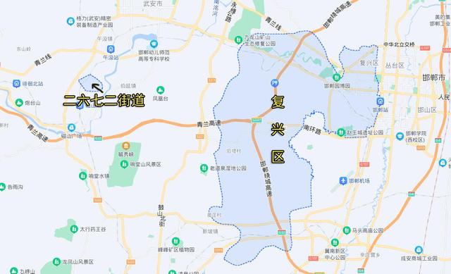 二六七二在哪兒呢?在河北省邯鄲市復興區。在地圖上搜索“復興區”,會發現在西部有一小塊飛地,距離復興區主體直線距離有十多公里,實際距離就更遠了。飛地被武安市(縣級市)四面環繞,這塊飛地就是二六七二街道的所在地,面積只有3.6平方公里。