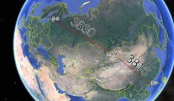 上圖:芬蘭→新疆阿勒泰地區(qū)≈阿勒泰地區(qū)→廣東的湛江地區(qū)(3800公里)