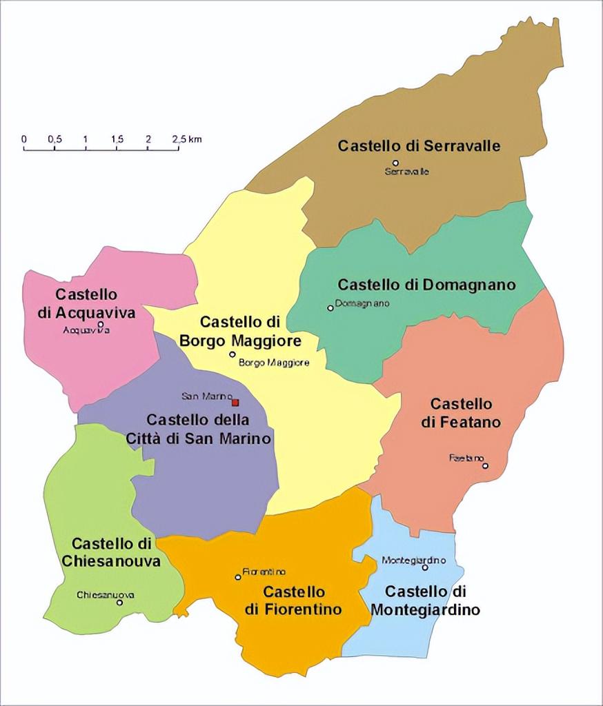 下面是圣馬力諾的地圖,這里面標(biāo)注的9個(gè)市鎮(zhèn),其實(shí)是圣馬力諾下面各區(qū)的“首府”,而不是說(shuō)圣馬力諾只有9個(gè)市鎮(zhèn)。