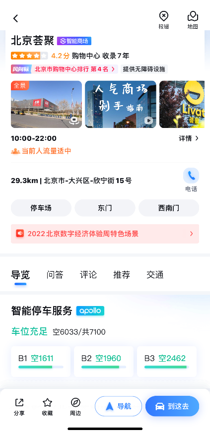 大型商業綜合體是百度地圖車位級導航應用的核心場景之一。百度地圖憑借目前國內獨家實現的室內外一體化導航產品,為顧客打造流暢、優質的購物出行體驗。以北京薈聚為例,作為具有國際標準的一站式超區域型購物中心之一,該購物中心擁有7000余個停車泊位,停車無疑成為提升購物體驗的重要場景。