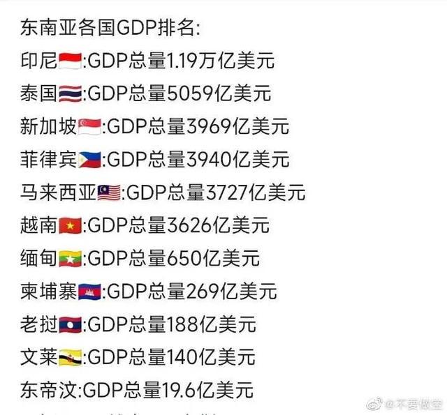 殊不知越南GDP不及泰國和馬來西亞,目前連菲律賓都超過越南,越南在東南亞的GDP只能排六。
