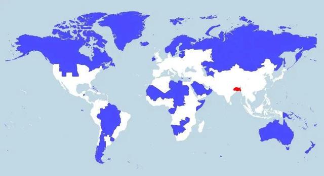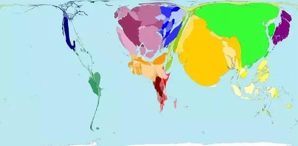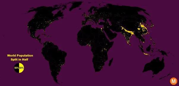 這是另一張世界人口地圖。世界總人口的一半是黃色的,另一半是黑色的。