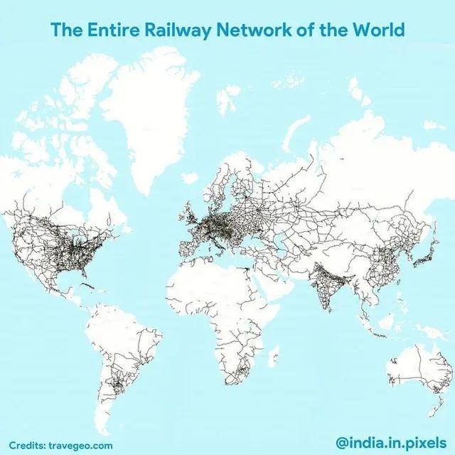 世界鐵路網(wǎng),美國總里程25萬公里排第一,中國15萬公里排第二,但中國高鐵里程排第一,占比更大。