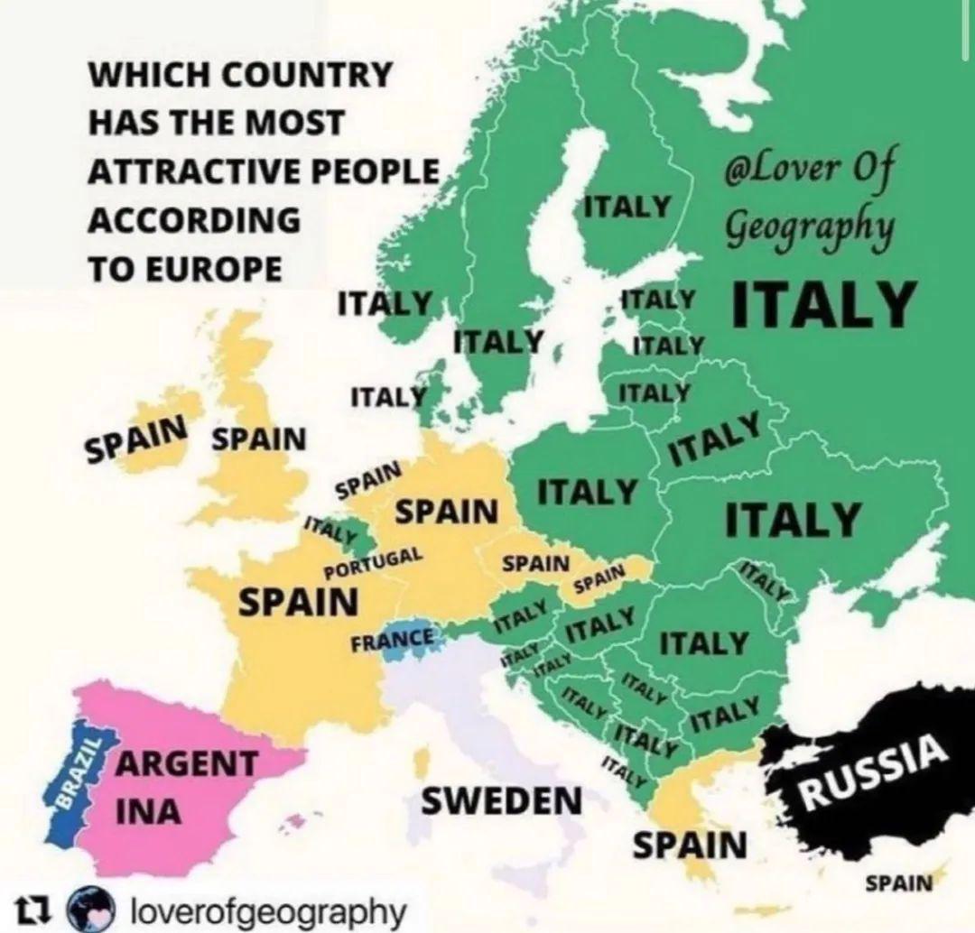在歐洲,認(rèn)為的哪個(gè)國家的人最有魅力?意大利人和西班牙人最受歡迎,西班牙和葡萄牙,用一種不明顯的方式選了自己…意外的是,土耳其竟然選了自己的世仇俄羅斯…
