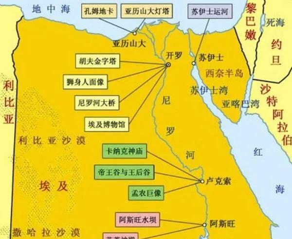 埃及位于非洲東北部的尼羅河下游地區,北臨地中海與歐洲相望,東臨紅海與亞洲的阿拉伯半島相望。埃及的東北角原本有蘇伊士地峽與亞歐大陸相連,但近代在此開通了蘇伊士運河后,亞非兩大陸也就從此分割開來。也因為這個原因,埃及從此成為了東西方航運的咽喉,具有十分突出的全球性戰略地位。