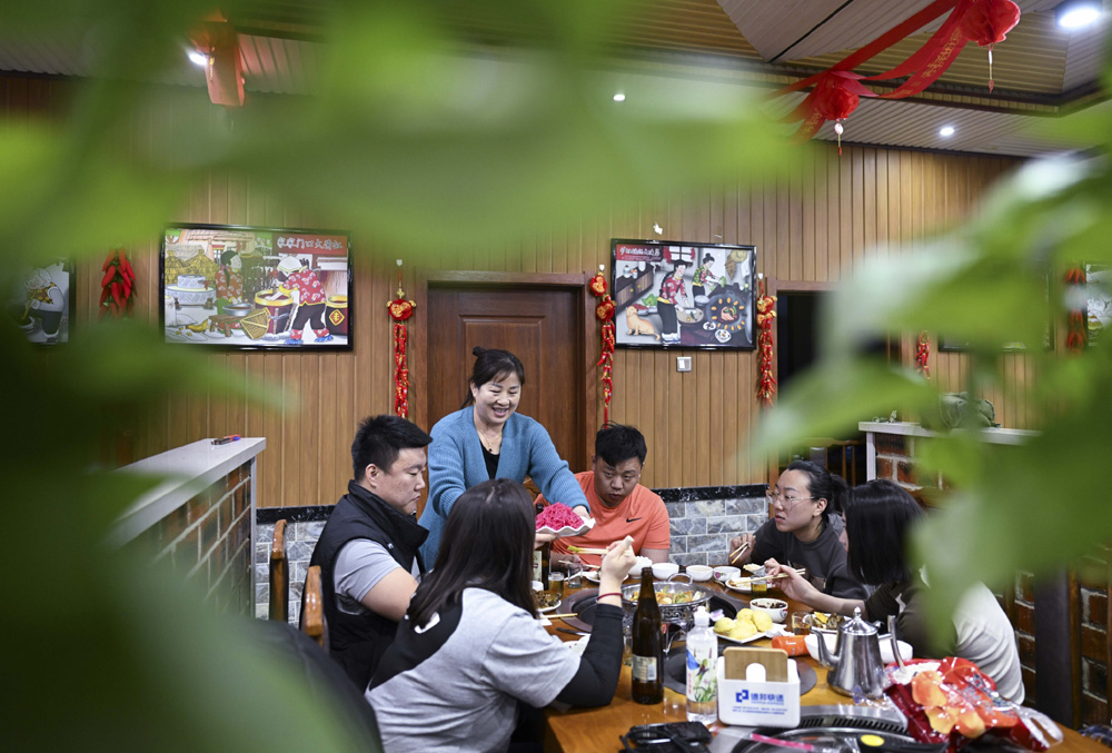 今年53歲的于淑芬是南溝村第一批農家樂經營者。13年前,因經常有路過的“雪友”前來詢問哪里可以吃飯、住宿,讓本就冬日無事的于淑芬萌生了“何不自己開個餐館賺點家用”的想法。如今,經過一步步發展經營,她開辦的農家樂已頗具規模,每個雪季能夠營收數十萬元。“現在我們村里,冬天才是一年中最忙的時候。家家戶戶都在盼著下雪,雪越大,游客越多。”于淑芬說道。2023年2月11日,于淑芬為客人們上菜。新華社記者 陶希夷 攝