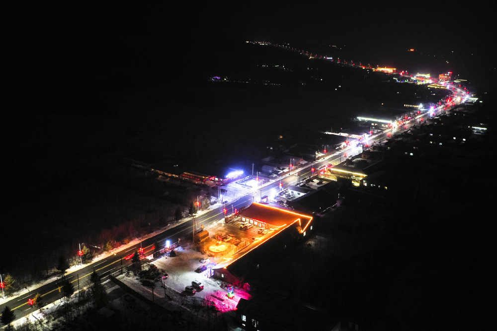 今年53歲的于淑芬是南溝村第一批農家樂經營者。13年前,因經常有路過的“雪友”前來詢問哪里可以吃飯、住宿,讓本就冬日無事的于淑芬萌生了“何不自己開個餐館賺點家用”的想法。如今,經過一步步發展經營,她開辦的農家樂已頗具規模,每個雪季能夠營收數十萬元。“現在我們村里,冬天才是一年中最忙的時候。家家戶戶都在盼著下雪,雪越大,游客越多。”于淑芬說道。2023年2月11日,夜幕下的吉林市永吉縣北大湖鎮南溝村燈火通明,農家樂遍布這條通往雪場的公路兩邊(無人機照片)。 新華社記者 許暢 攝