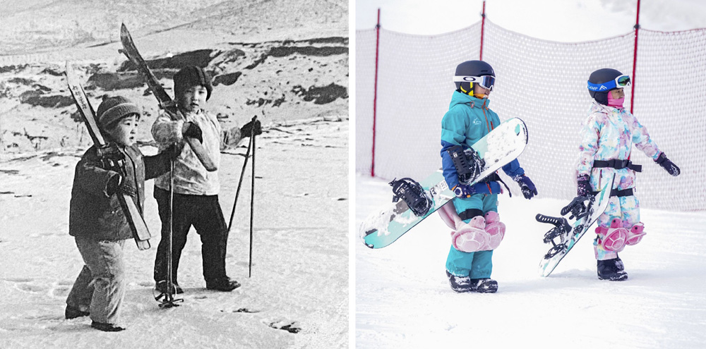 這是一張拼版照片。左圖:1973年2月14日,吉林省通化市5歲的兒童吳小明(左)和于曉紅(右),扛著滑雪板,來到市郊的山上學習滑雪(新華社發);右圖:2023年2月10日,孩子們帶著滑板走在萬峰滑雪場(新華社記者顏麟蘊攝)。