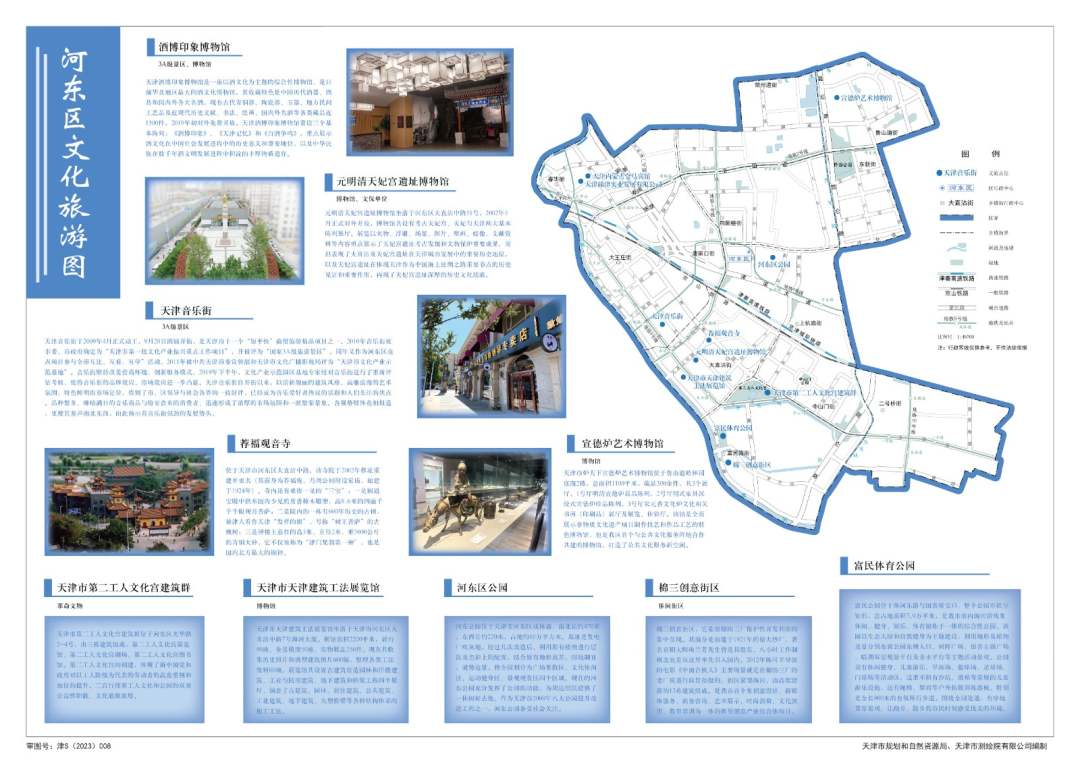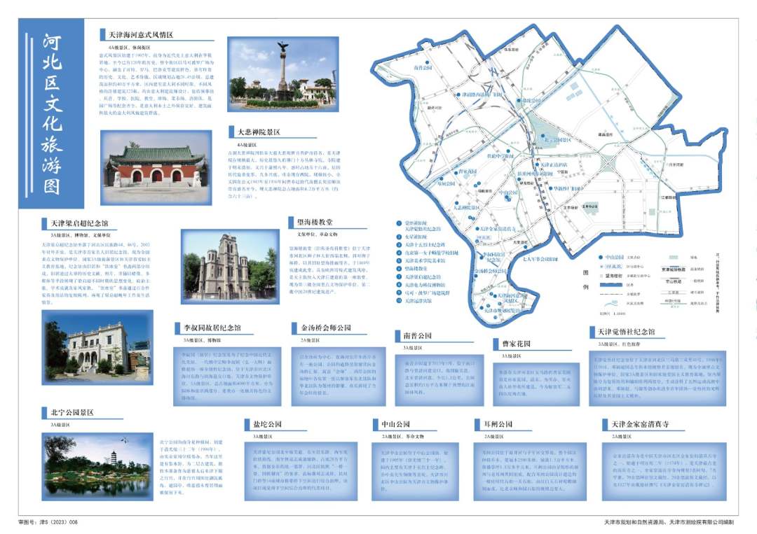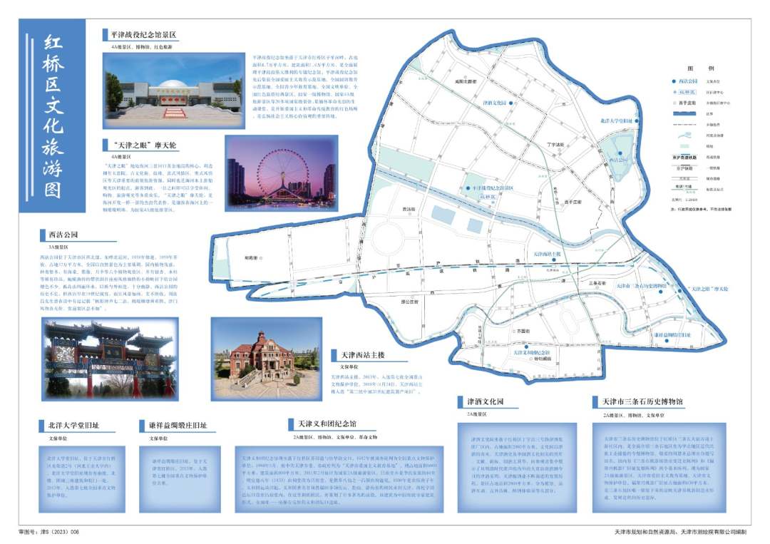 本次發布的公益性地圖共六幅,分別為《和平區文化旅游圖》、《河西區文化旅游圖》、《南開區文化旅游圖》、《河北區文化旅游圖》、《河東區文化旅游圖》、《紅橋區文化旅游圖》。該公益性地圖以天津市內六區的文旅資源為切入點,圖文并茂的展示了五大道文化旅游區、古文化街旅游區、意式風情區等140余處文化旅游資源,依托地圖簡明直觀的特點展示各區文化旅游資源分布情況,形成專題公益性地圖產品。公益性地圖體現地理信息服務百姓美好生活的功能定位,將更好的為社會大眾提供便民信息服務、地圖知識服務和城市文化服務,也將成為展示宣傳我市的新窗口,讓人們更加了解天津這座城市的文化旅游資源,增加城市吸引力,賦能天津經濟發展。