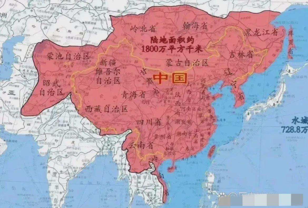 這是有心的網友整理的中國歷朝歷代疆域疊加地圖。總面積有1800平方公里。蒙古帝國的只算元朝控制的疆域。這樣看的話,整個地圖像不像一條大鯨魚?